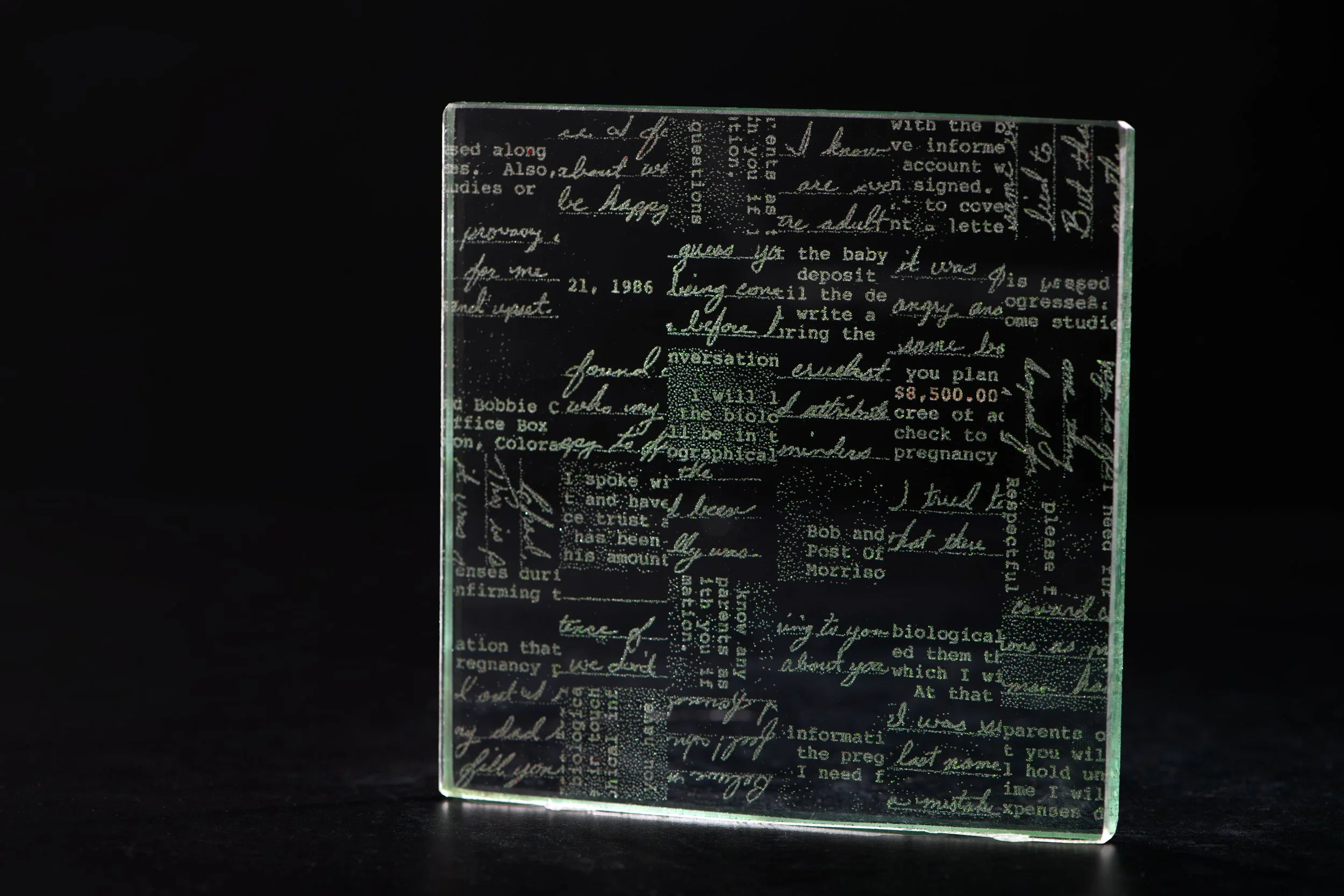 "Delivered to Recipient" - laser engraved glass, print plate, 8" x 8"; Private collection